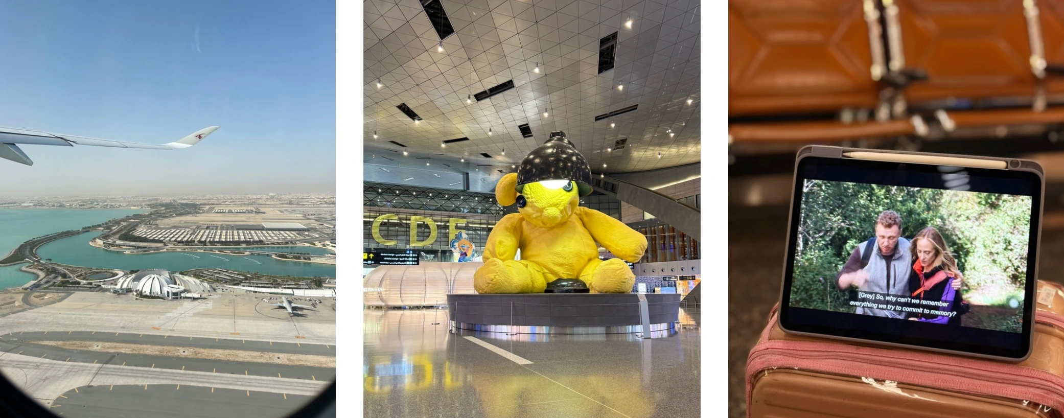 Taking off – yet again, a rare sight of the iconic bear empty, and a downloaded Grey’s Anatomy episode to kill time